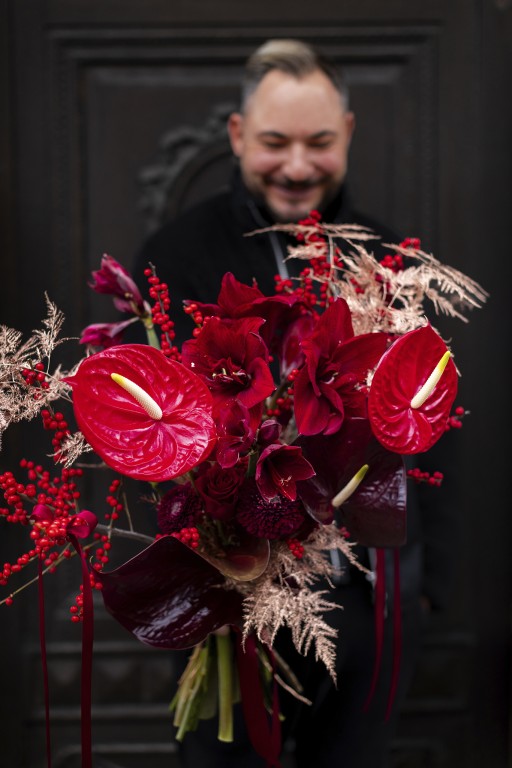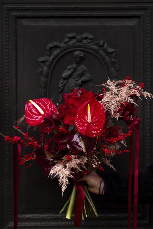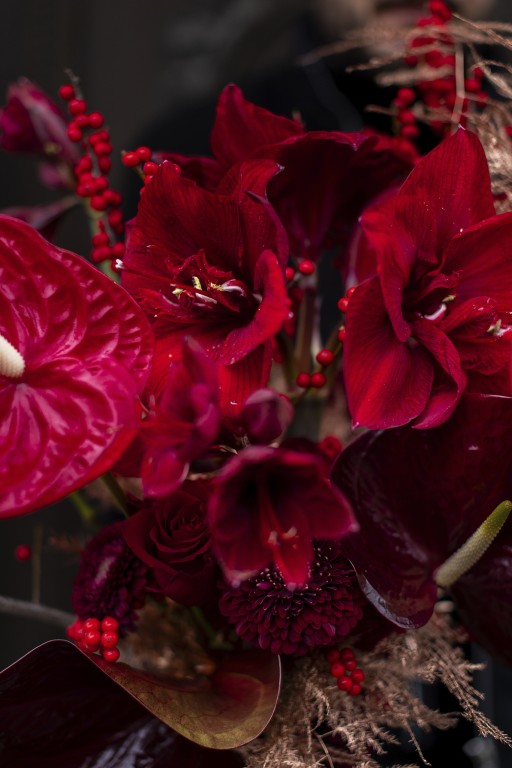 „Velvet Flame“ ist ein edler Blumenstrauß in tiefen Rottönen – mit glänzenden Anthurien, Amaryllis und saisonalen Highlights.
