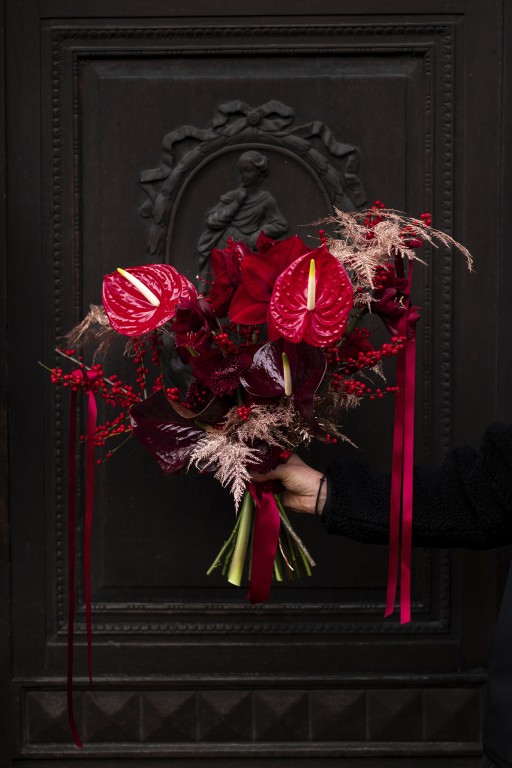 Velvet Flame– luxuriöser Blumenstrauß in dunklem Rot