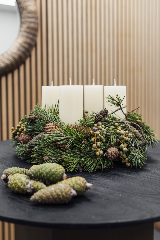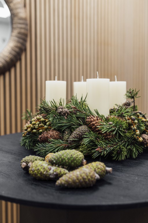 Der Adventskranz „PINORA“ verkörpert moderne Natürlichkeit und handwerkliche Präzision.