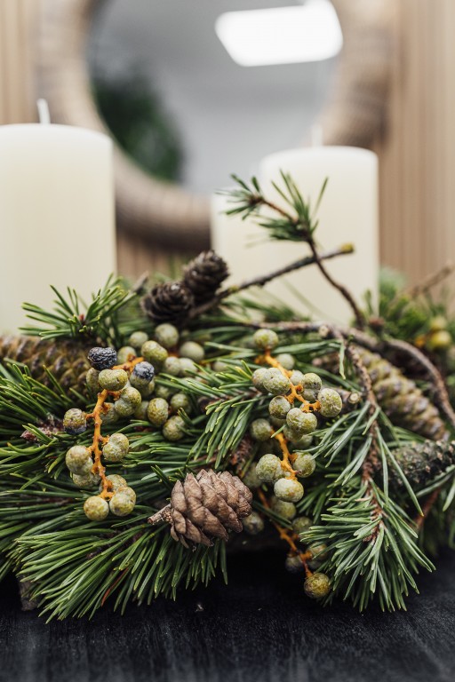 Sorgfältig gefertigt aus Pinus-Mugo-Zweigen, italienischen Pinienzapfen, Zederzapfen und Seedatteln, bringt er eine warme, natürliche Eleganz in dein Zuhause.